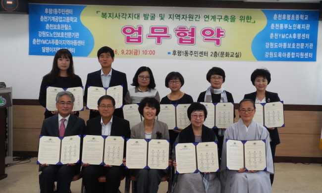강원도노인보호전문기관(관장 : 한일지)에서는 2016년 보건복지부의 읍면동 복지허브화 계획에 맞춰 춘천시 복지사각지대를 해소하고 주민들의 복지체감도 향상 및 지역주민과의 밀착된 복지안전망을 구현하기 위해 맞춤형 복지팀을 설치·운영함에 따라 관내외 각 기관들과의 원활한 업무 협조를 위해 개최된 맞춤형복지 업무협약식에 한일지 관장이 참석하여 지역자원과 주민센터의 연계체계를 구축하는 시간을 마련하였습니다.